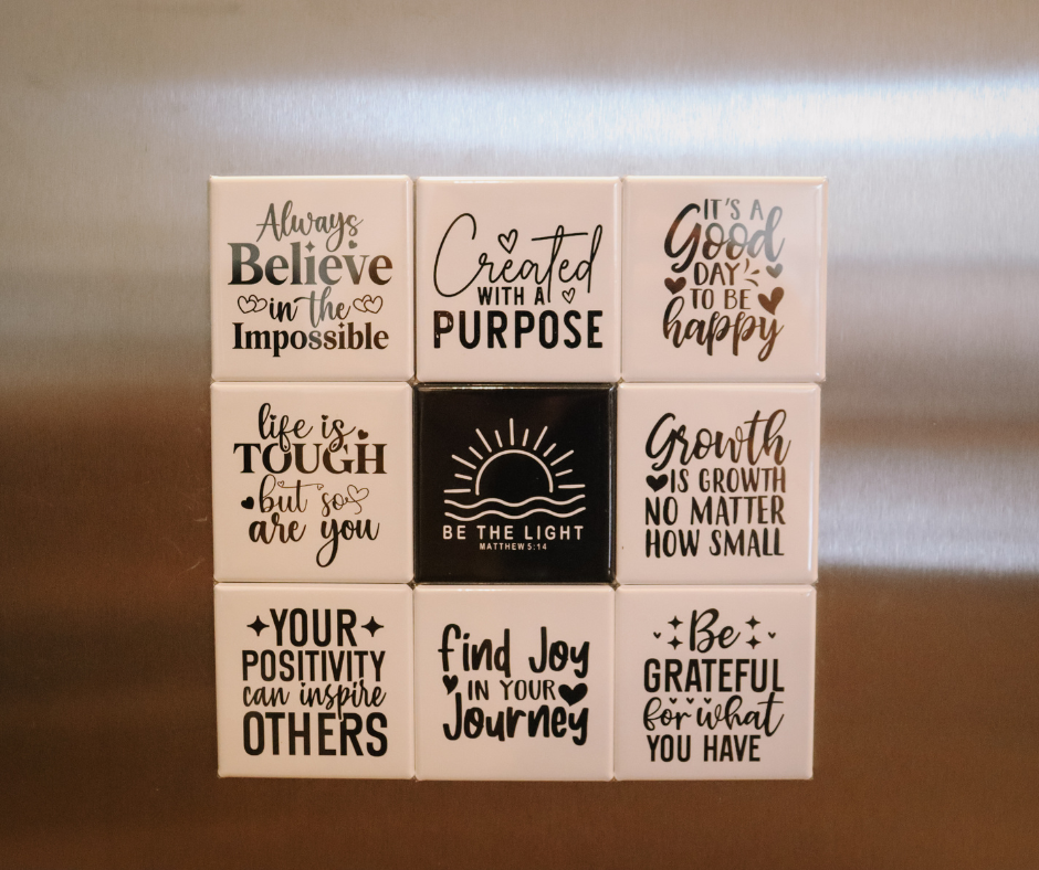 This set of 9 inspirational photo magnets features uplifting quotes designed to brighten your day. Perfect for your fridge, office, locker, or any magnetic surface, these high-quality magnets serve as daily reminders of encouragement, motivation, and gratitude.